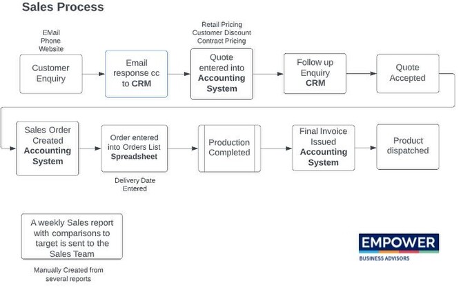 To get an idea of the complexity, here’s an overview of the company’s sales process that Empower Business documented as part of the systems analysis: